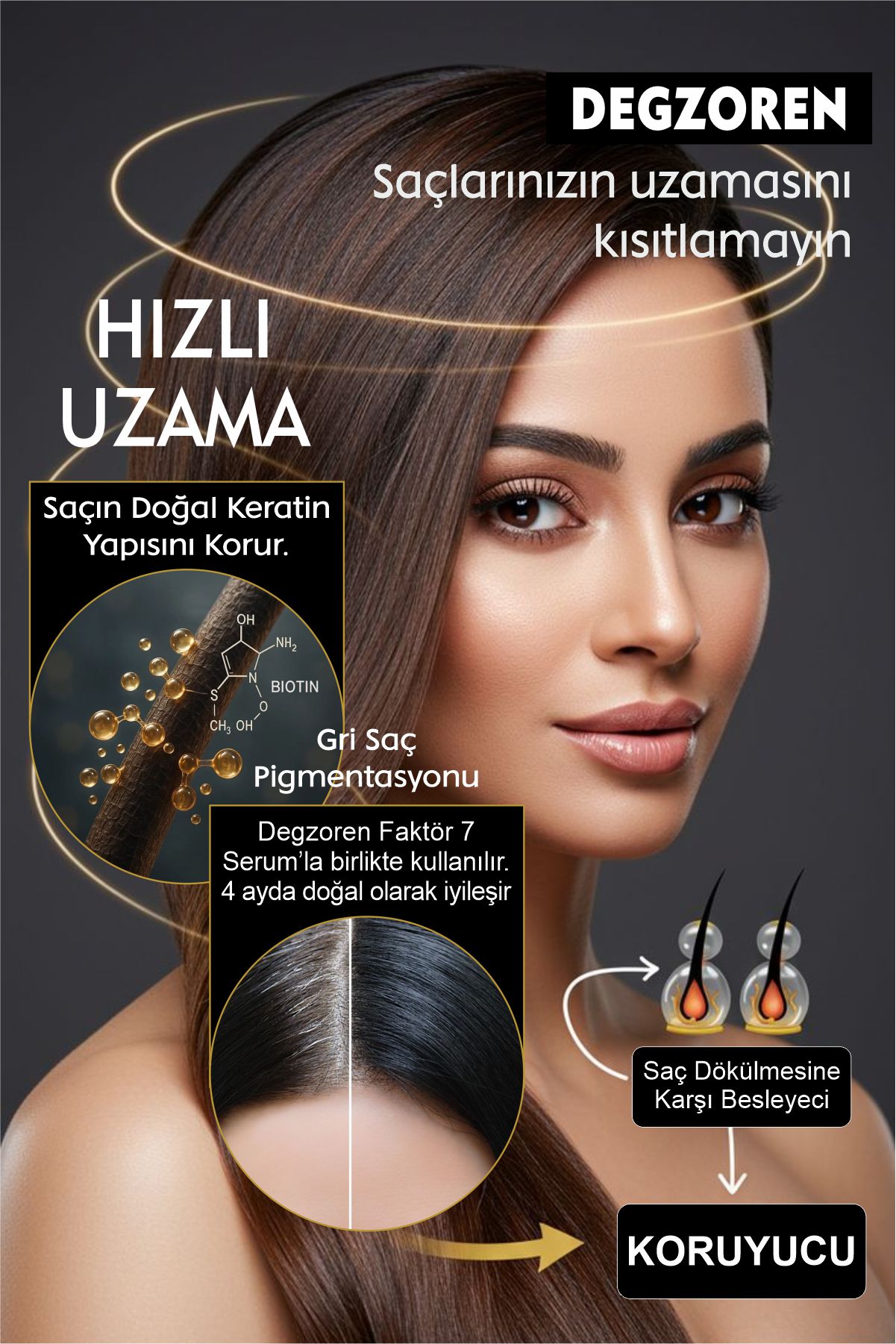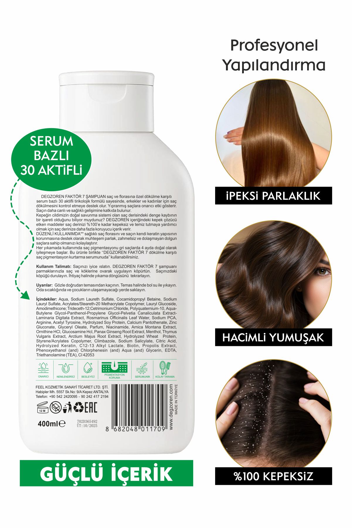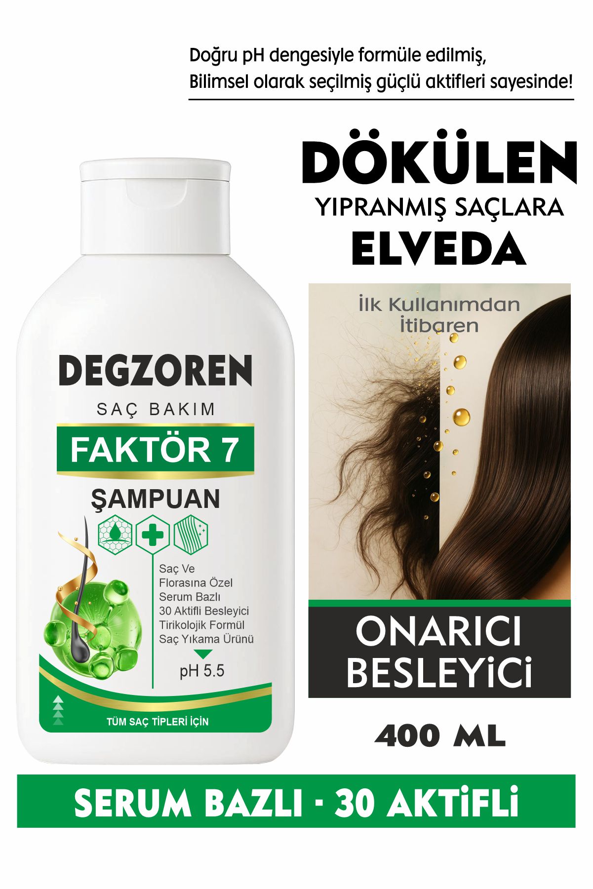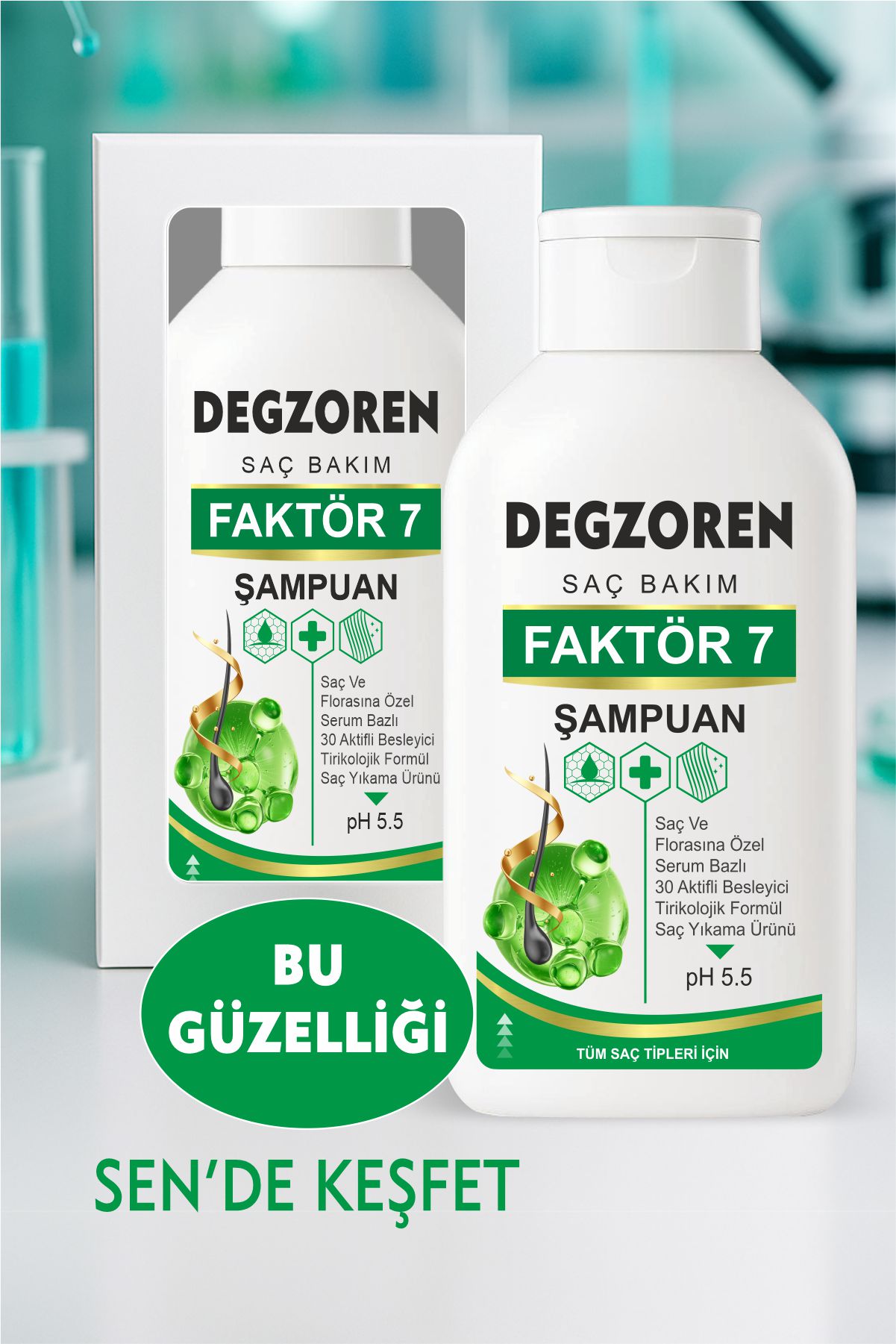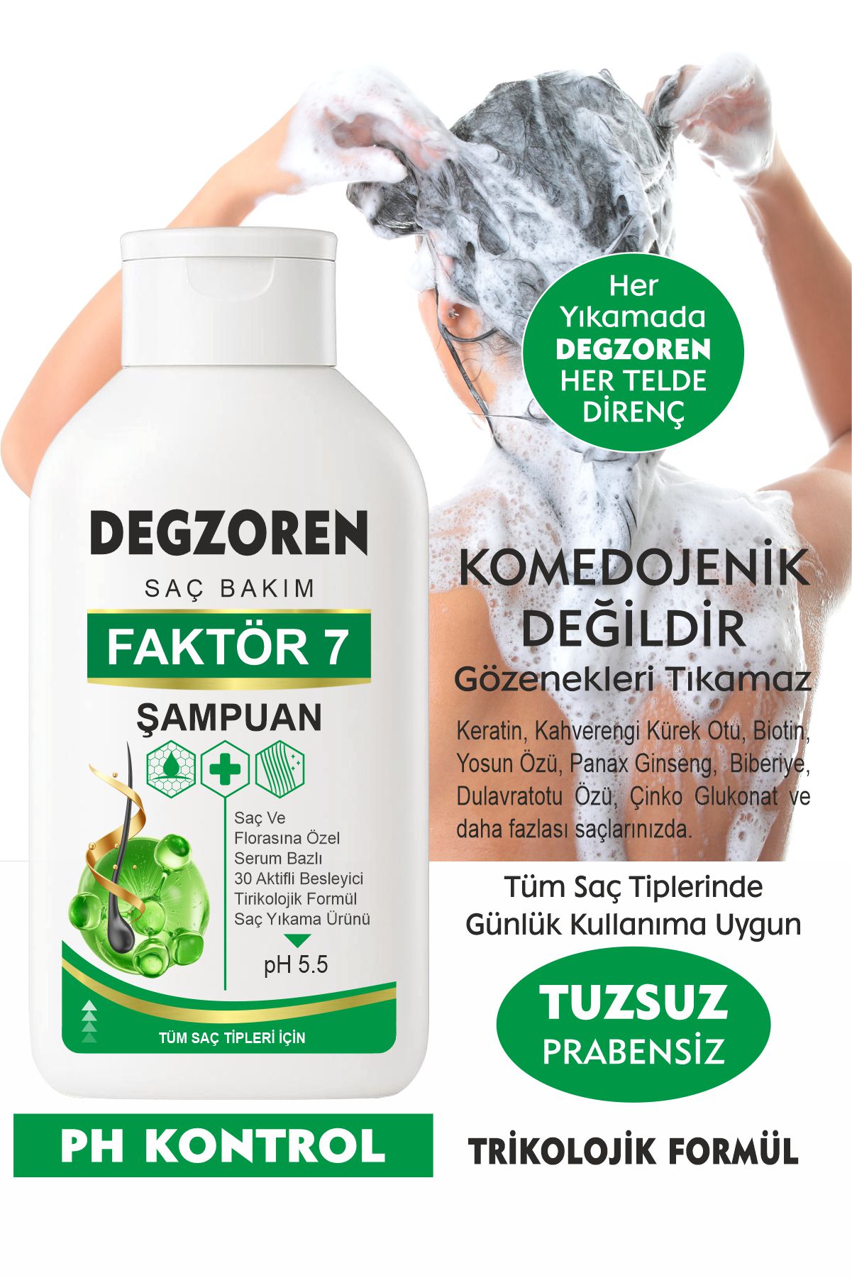 Bütün bu özellikler ve ayrıcalıklar Degzoren Faktör 7 Şampuan şişelerinde.