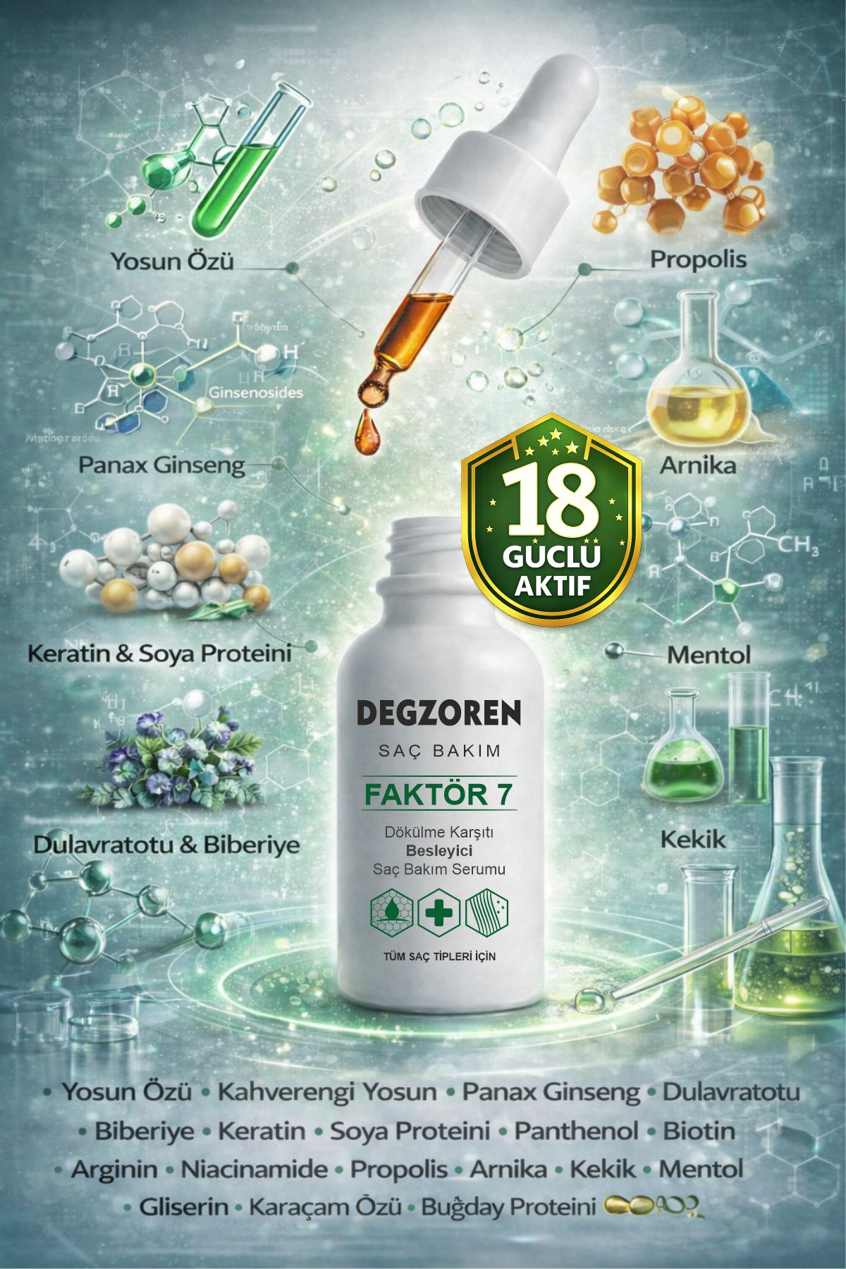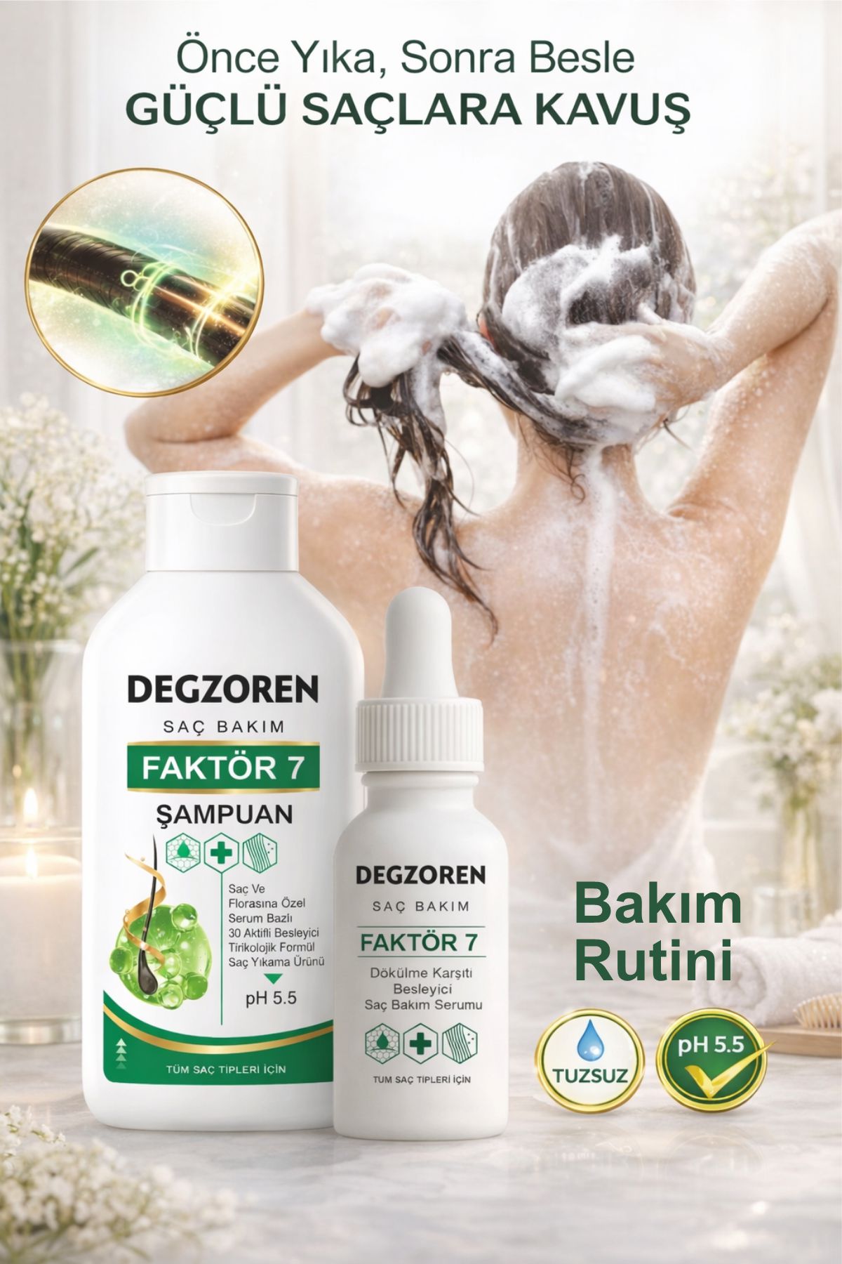DEGZOREN Faktör 7 Saç Bakım Şampuanı; saç dökülmesine eğilimli, yavaş uzayan, zayıflamış, kepekli ve yıpranmış saçların bakımını desteklemek amacıyla geliştirilmiştir.