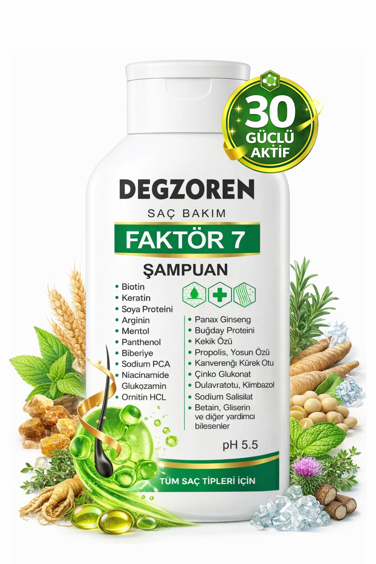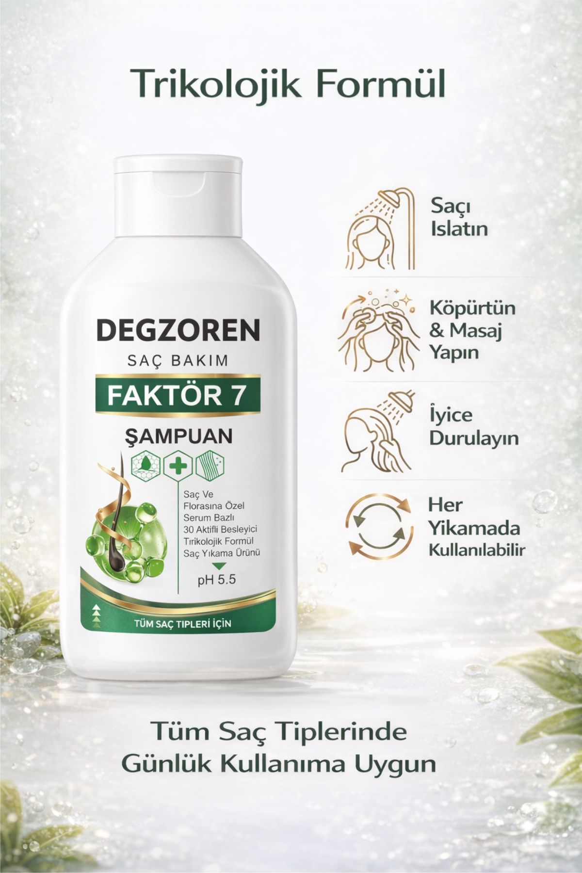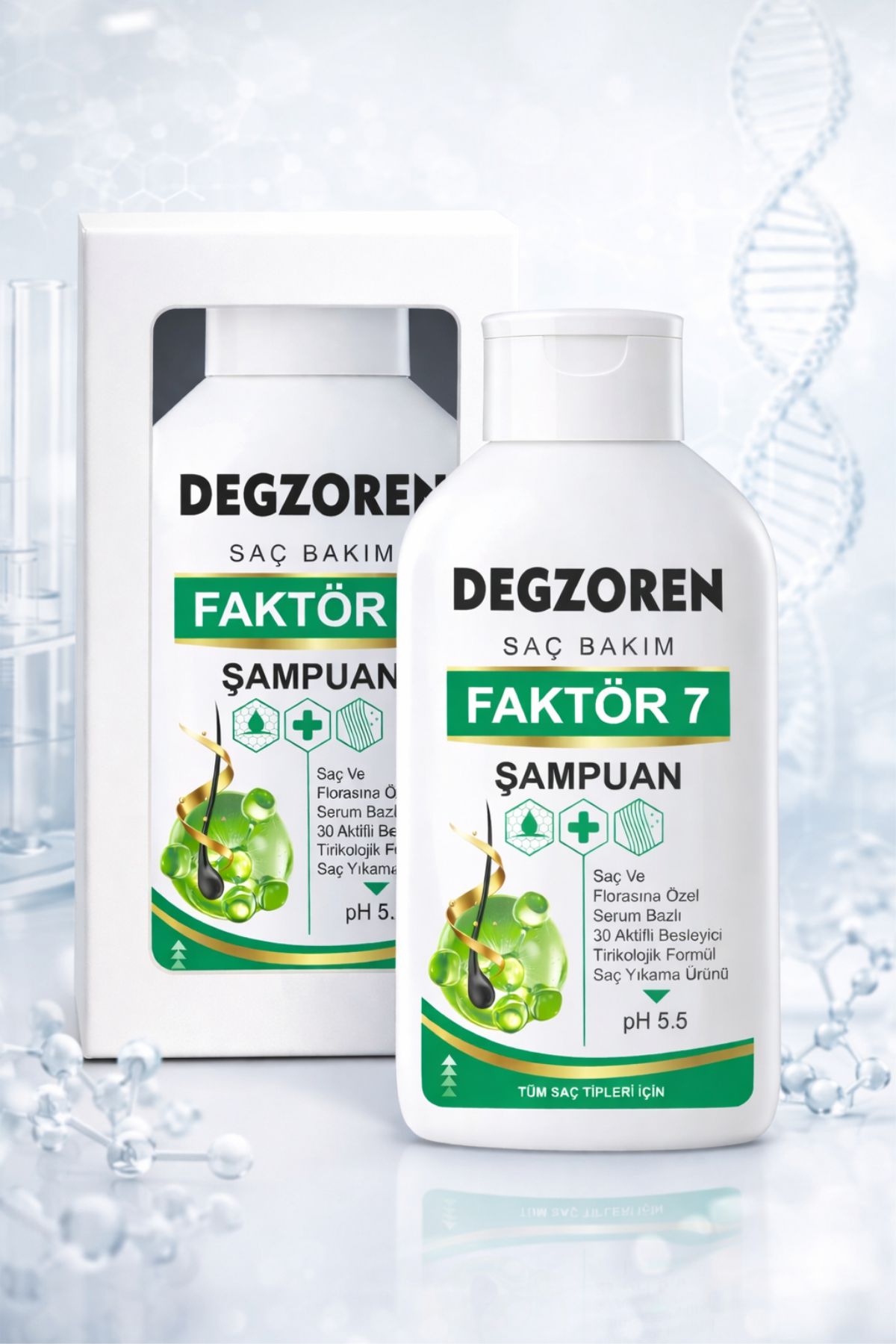 DEGZOREN Faktör 7 Saç Bakım Şampuanı; saç dökülmesine eğilimli, yavaş uzayan, zayıflamış, kepekli ve yıpranmış saçların bakımını desteklemek amacıyla geliştirilmiştir.