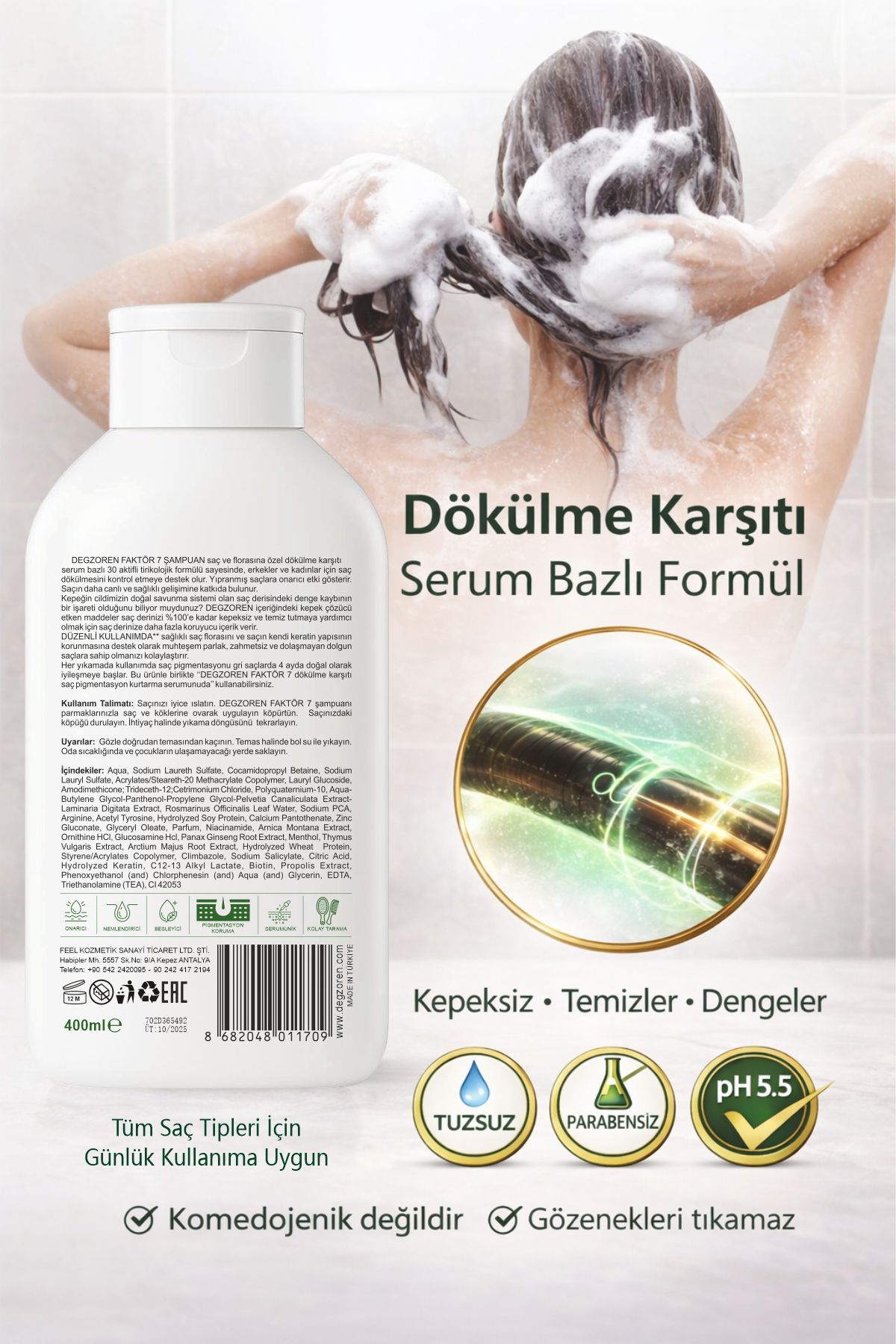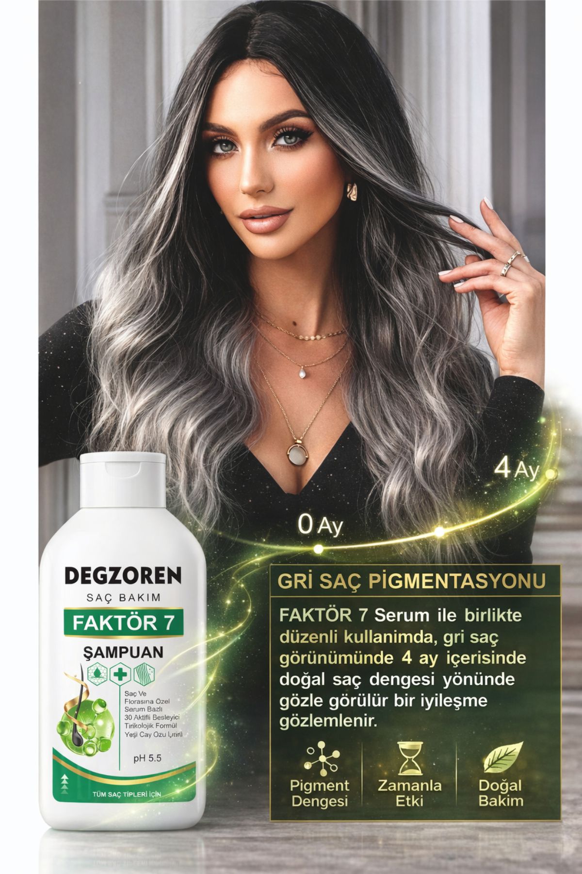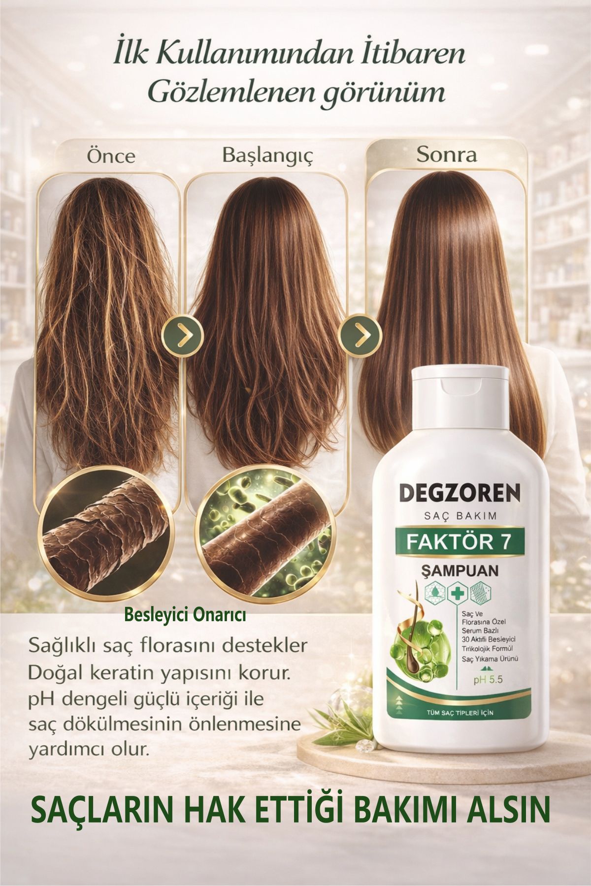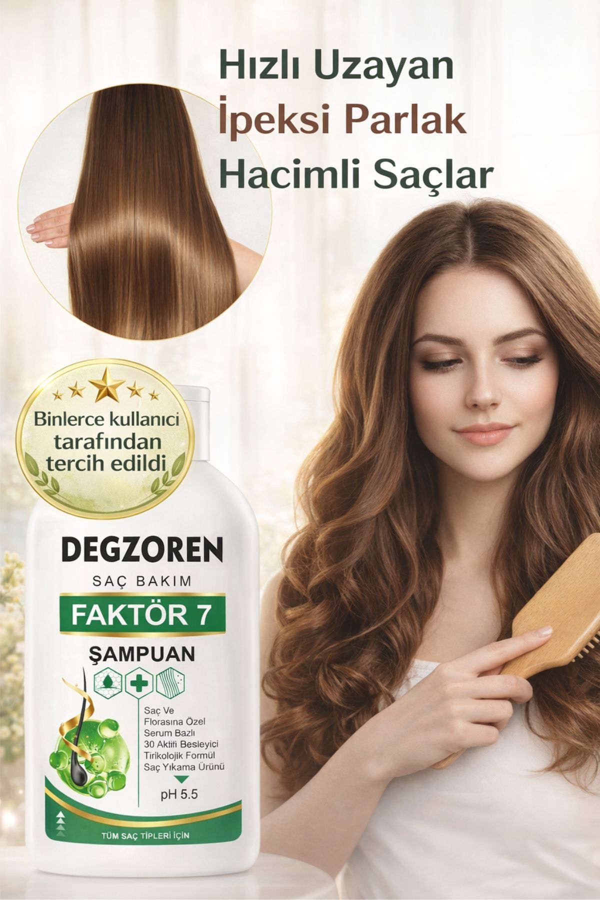 DEGZOREN Faktör 7 Saç Bakım Şampuanı; saç dökülmesine eğilimli, yavaş uzayan, zayıflamış, kepekli ve yıpranmış saçların bakımını desteklemek amacıyla geliştirilmiştir.