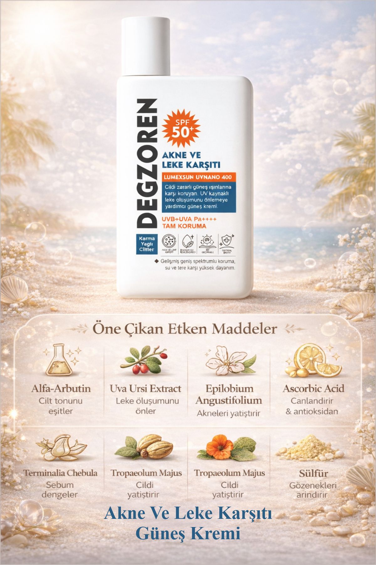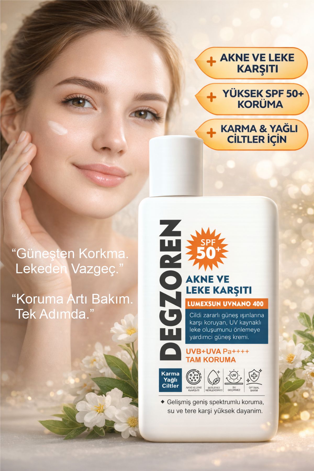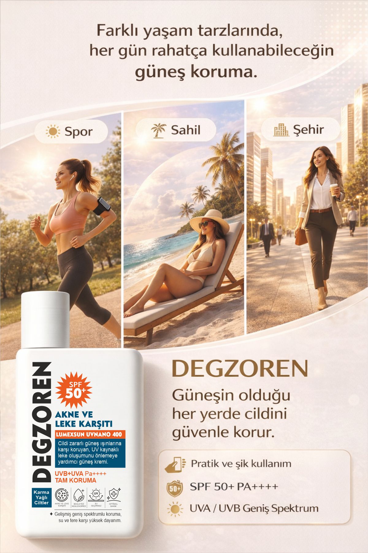 DEGZOREN SPF 50+ PA++++ Güneş Kremi; UVA ve UVB ışınlarına karşı geniş spektrumlu koruma sağlamaya yardımcı olan hibrit güneş filtreleri içeren formülüyle, özellikle akneye eğilimli, yağlı ve hassas ciltlerin günlük kullanımına uygundur.