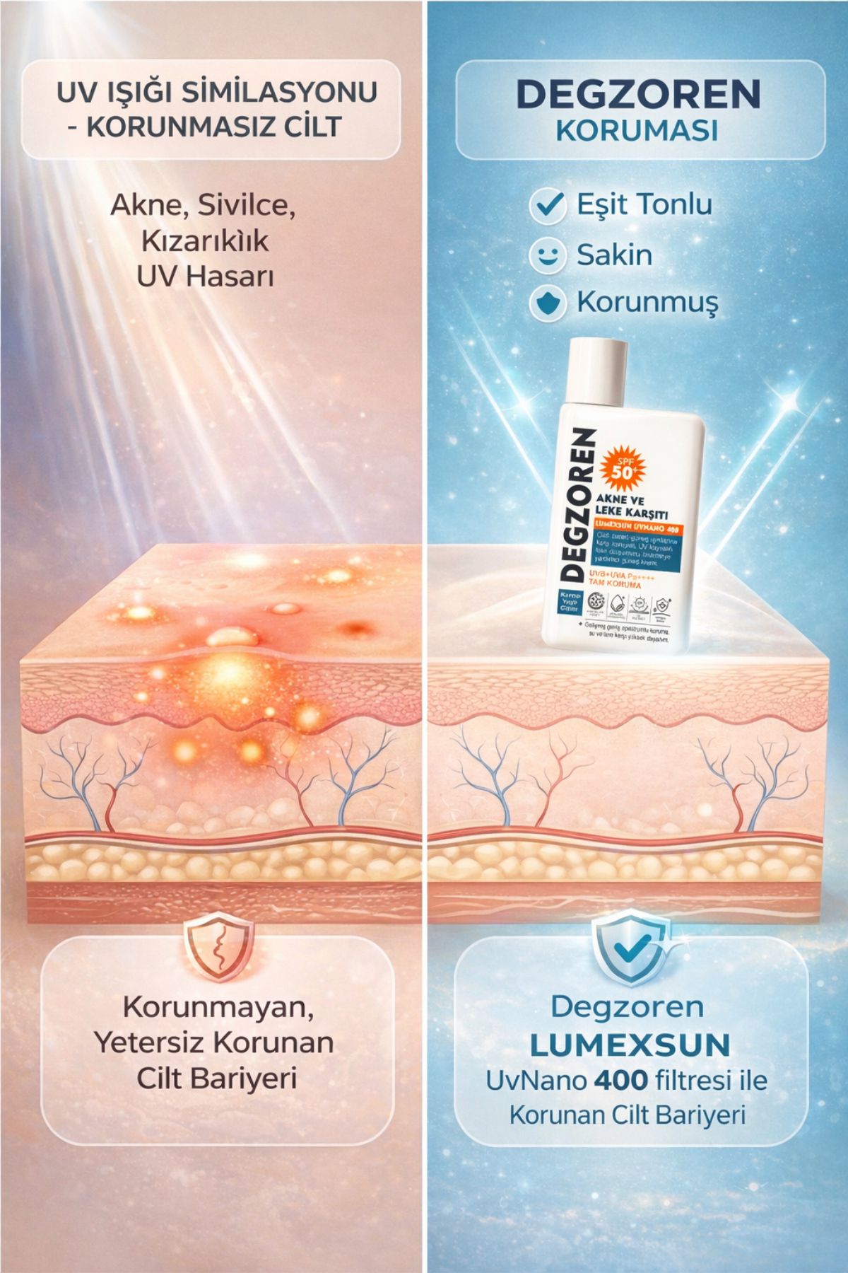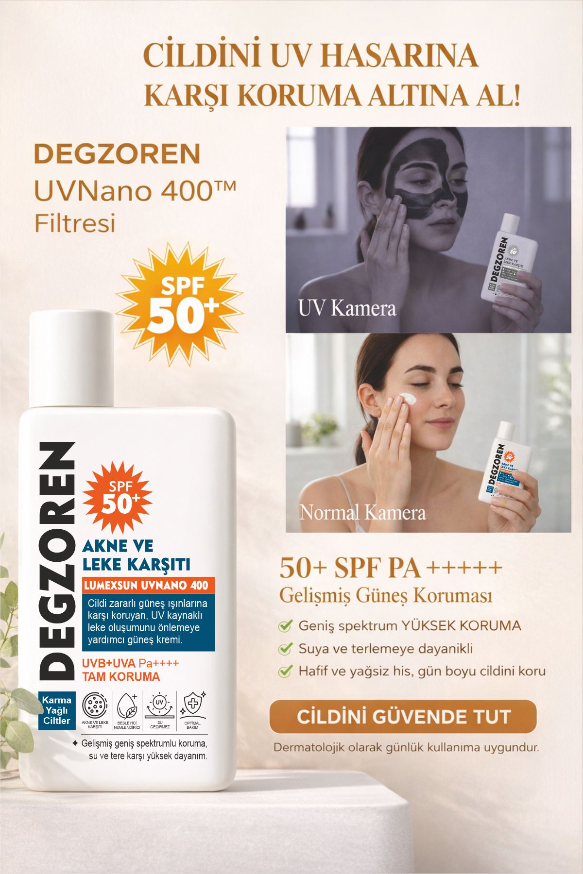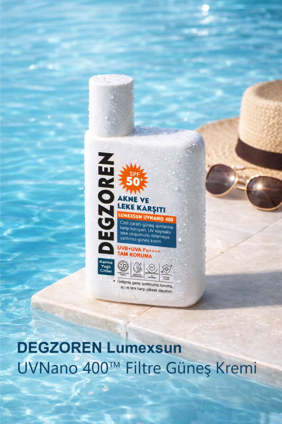 DEGZOREN SPF 50+ PA++++ Güneş Kremi; UVA ve UVB ışınlarına karşı geniş spektrumlu koruma sağlamaya yardımcı olan hibrit güneş filtreleri içeren formülüyle, özellikle akneye eğilimli, yağlı ve hassas ciltlerin günlük kullanımına uygundur.