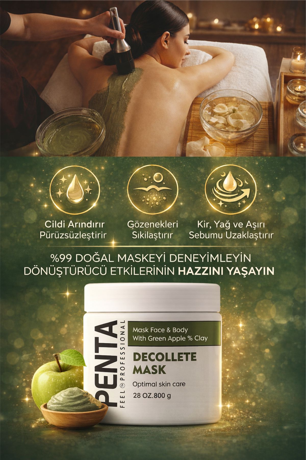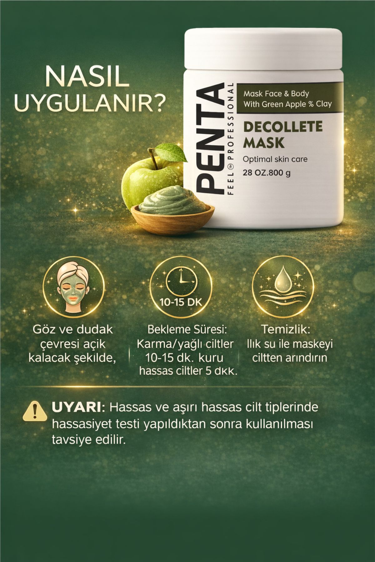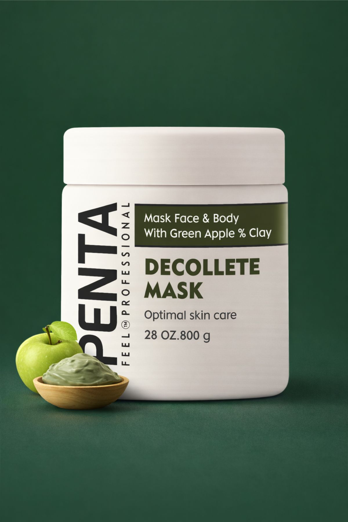 PENTA Feel Professional Decollete Mask, yeşil elma özü ve doğal kil içeriğiyle yüz ve vücut için profesyonel bakım sunar.